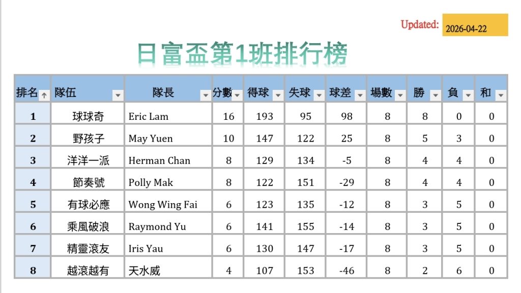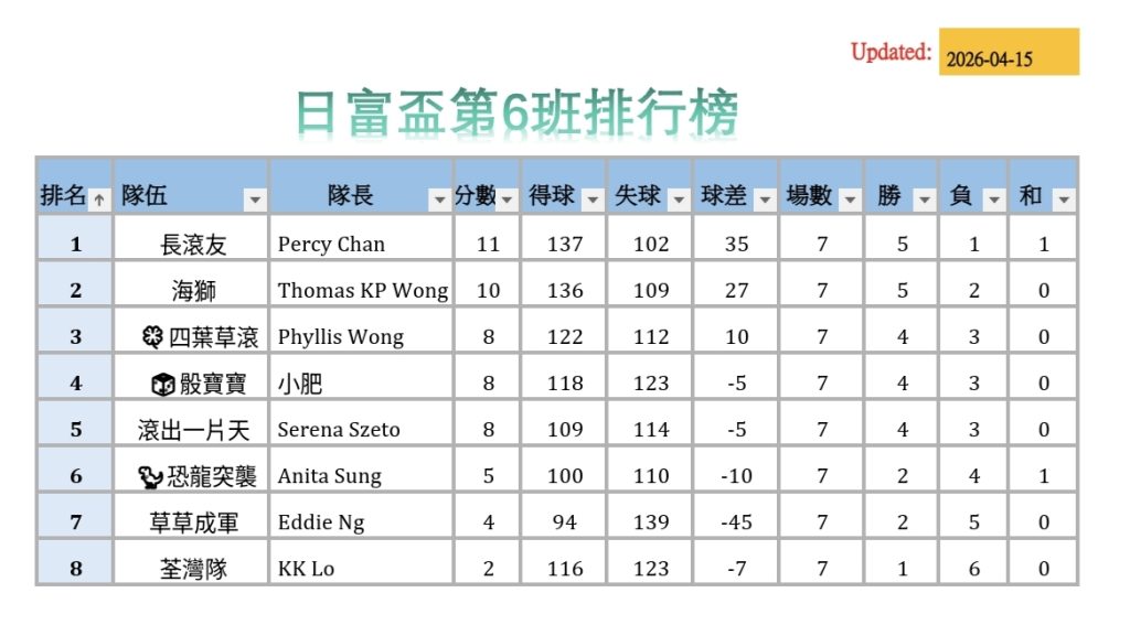 贊助單位: 💼 日富資產策劃有限公司📅 賽事時間: 2026年1月至7月🔄 比賽形式: 雙循環聯賽制🕙 比賽日: 每月兩場,逢星期三上午 10:00 – 13:00
